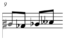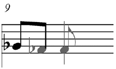 und anschließend auf die erste Note von Takt 9 (Ges). Ein Kreuz erscheint neben der Note. PrintMusic notiert automatisch ein b am zweiten Ges, weil es nun nicht mehr mit dem ersten verbunden ist.