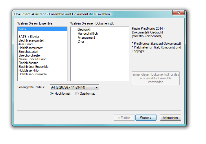 Der PrintMusic-Dokument-Assistent sollte nun wie folgt aussehen: