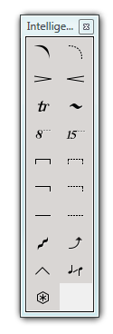 Die Bögen und Linien dieser Palette heißen Intelligente Zeichen, weil sie sich intelligent verhalten. Wenn sich z. B. ein Takt verbreitert, so tut dies auch das dazugehörige Intelligente Zeichen. Oder wenn ein Intelligentes Crescendo am Ende einer Akkolade beginnt und bis in die darunter nachfolgende andauert, spaltet es sich automatisch in zwei Zeichen auf.