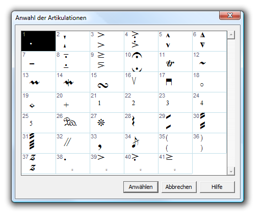 mit den gängigsten Artikulationszeichen (Staccato-Punkte, Akzente, Fermaten) und