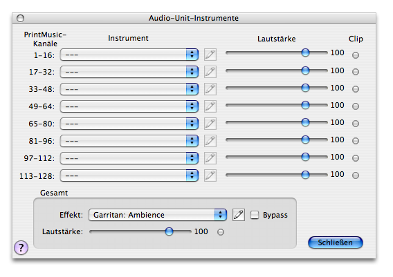 In dieser Dialogbox wählen Sie das gewünschte AU-Instrument, dass Sie mit PrintMusic verwenden wollen. Mit Hilfe dieser Dialogbox können Sie AU-Instrumentenbibliotheken laden und deren Lautstärke anpassen.