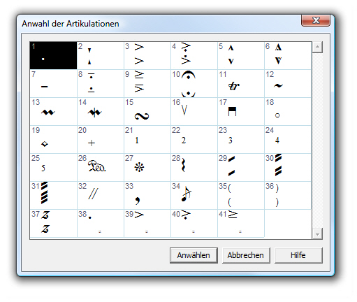 Ein Artikulationszeichen ist ein einzelnes Symbol, das sich nur auf eine einzige Note bezieht (z. B. ein Akzent, Stakkatopunkt oder eine Fermate). In dieser Dialogbox können Sie Artikulationszeichen auswählen. Die Zahl in der oberen linken Ecke jedes Anzeigefeldes ist die ID-Nummer.