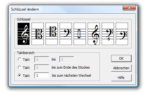 Sie können am Beginn eines beliebigen Taktes in der Partitur den Schlüssel wechseln. In dieser Dialogbox setzen Sie fest, welchen Schlüssel Sie benutzen wollen.