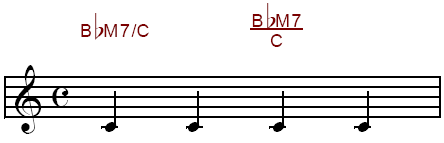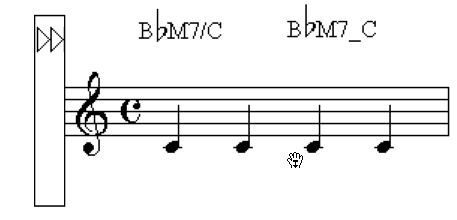 - Tippen Sie den Akkord ein, der in der Partitur erscheinen soll, wie z. B. „BbM7/C“. Geben Sie anstelle des Schrägstrichs einen Unterstrich (_) ein, wenn die Basston-Lage (in diesem Beispiel C) unter dem Grundton angezeigt werden soll. Sie können auch einen senkrechten Strich (|) eingeben, um die Basston-Lage leicht nach rechts verschoben unter den Grundton zu schreiben.