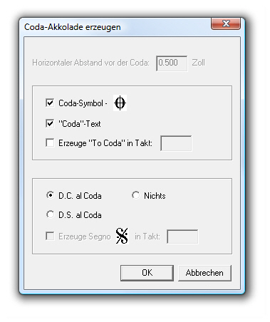 - D. C. al Coda • D. S. al Coda • Nichts • Erzeuge Segno in Takt __. Wählen Sie „D. C. al Coda“, um am Ende der Akkolade vor der Coda diese Angabe einzusetzen. Wählen Sie „D. S. al Coda“, um am Ende der Akkolade vor der Coda diese Angabe einzusetzen. Wählen Sie „Nichts“, um am Ende der Akkolade vor der Coda-Akkolade keinen Text einzusetzen. „Aktivieren Sie „Erzeuge Segno in Takt“, und geben Sie eine Taktzahl an, um in diesem Takt ein Segno einzusetzen. All diese Angaben werden als Wiederholungsangaben eingesetzt und können mit dem Wiederholungswerkzeug bearbeitet werden. Sie werden automatisch so definiert, dass sie die Wiedergabe entsprechend steuern. Im Falle eines „D. S. al Coda“ springt die Wiedergabe zum Segno-Zeichen (