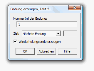 - Nummer(n) der Endung. Jede Nummer (durch Komma getrennt, falls es mehr als eine ist) die Sie hier eingeben, wird/werden unter der Klammer erscheinen, sobald der Taktstrich in der Partitur erscheint. Der eingegebenen Nummern wirken sich auf die Wiedergabe aus.