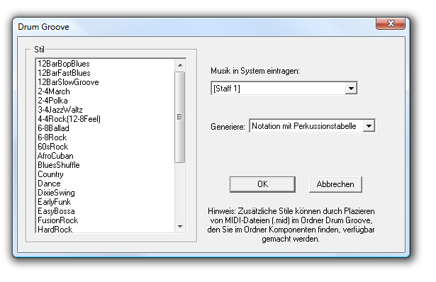 In der Dialogbox „Drum Groove“ können Sie in der Partitur eine Perkussionsstimme mit einem von vielen verschiedenen Rhythmen oder „Drum Grooves“ anlegen. Diese Drum Grooves enthalten Perkussionsnotation mit einer zugehörigen Perkussionstabelle.