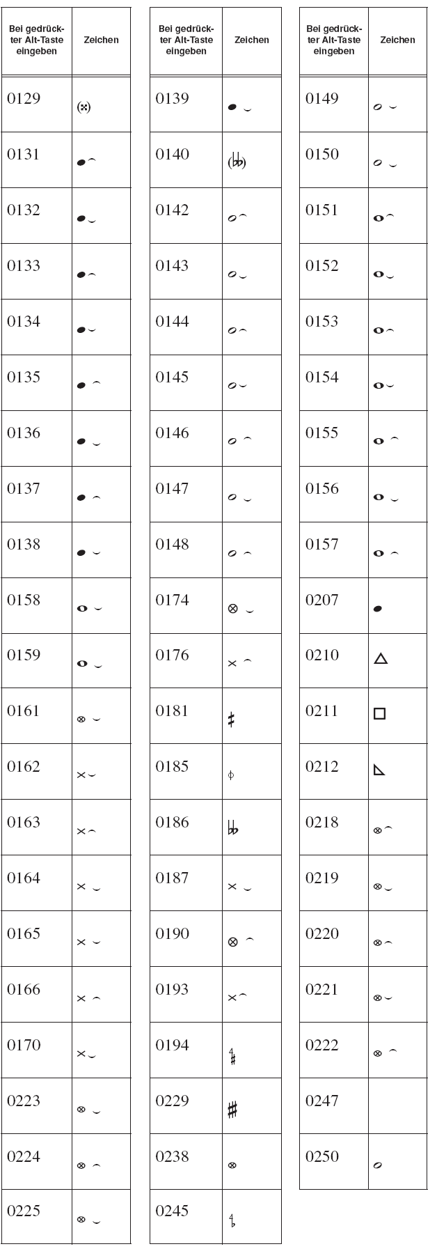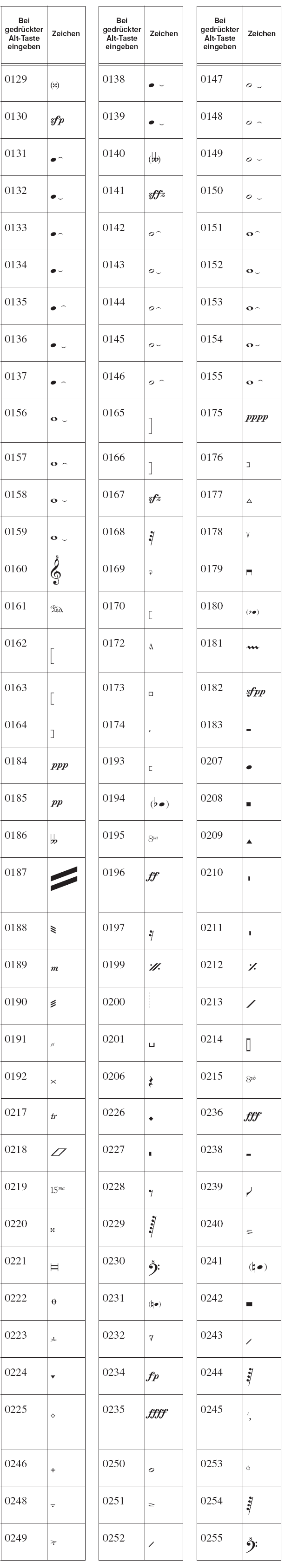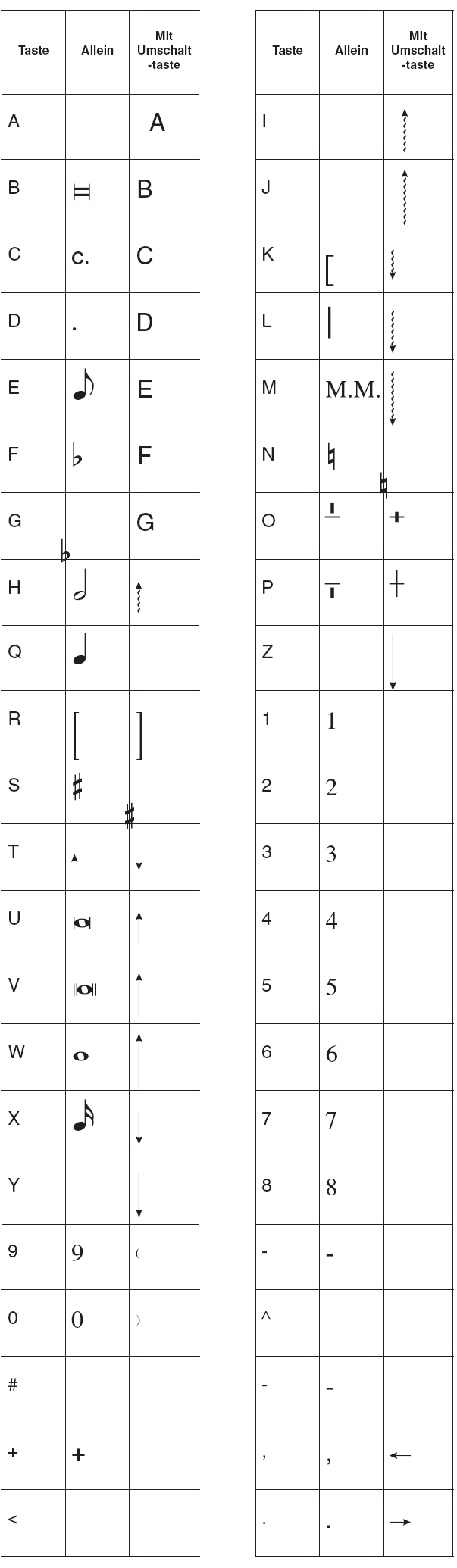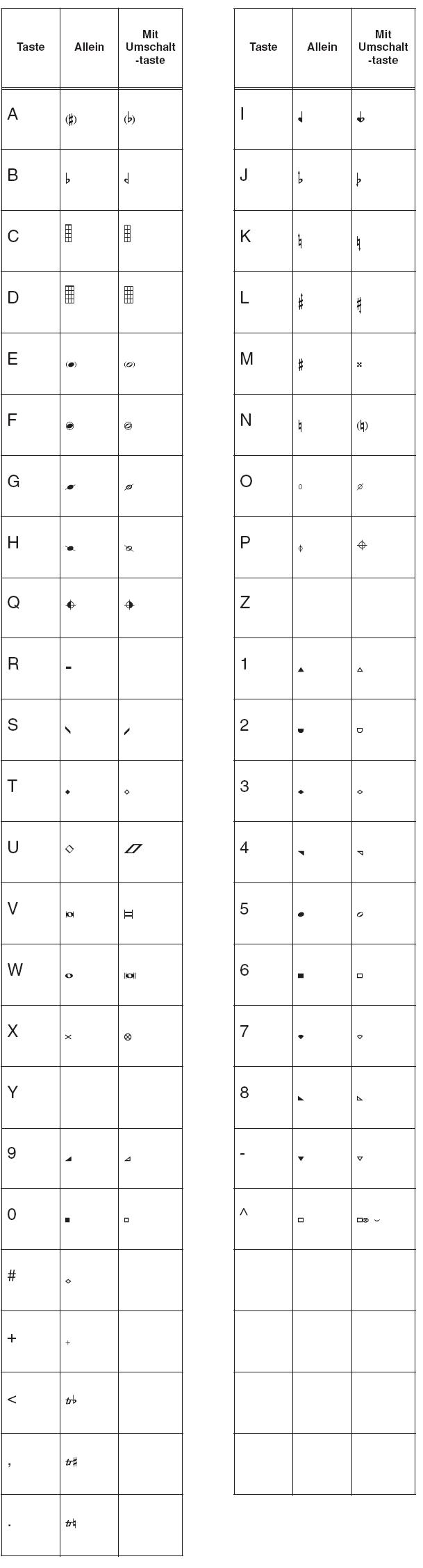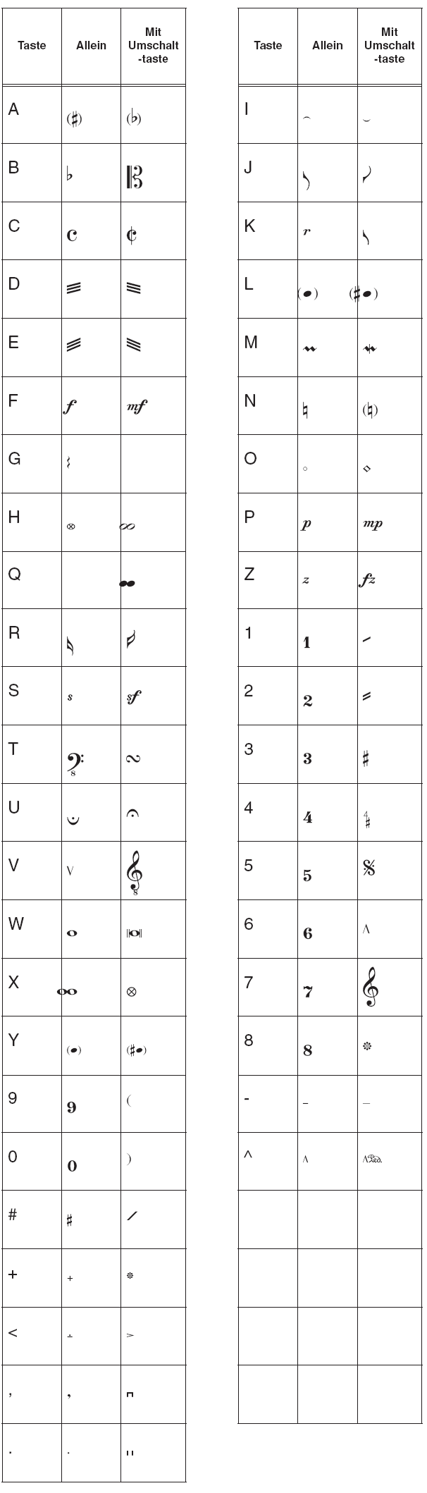 Die folgenden Zeichensätze sind in PrintMusic enthalten. Zu jedem Symbol ist das zugehörige Tastenkürzel angegeben. Denken Sie daran, dass Sie alle Symbole eines Zeichensatzes auch in der Zeichentabelle Ihres Betriebssystems anzeigen lassen können.