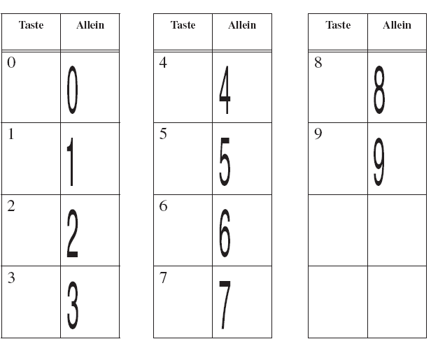 Im Folgenden ist der Zeichensatz Engraver Text dargestellt. Der Zeichensat zEngraver Text entspricht bei den Buchstaben und Zahlen verschiedenen Standard-Schriftarten: T steht für Times, H steht für Helvetica und NCS steht für New Century Schoolbook.