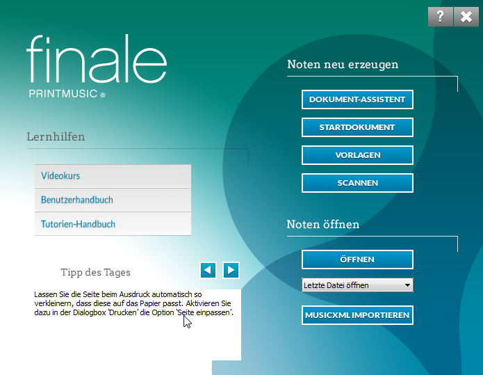 Wählen Sie diesen Befehl, um das Startfenster zu öffnen, in dem Sie verschiedene Optionen für das Erzeugen oder Öffnen von Dateien finden. Weiterhin können Sie von hier den PrintMusic-Videokurs oder das Handbuch aufrufen.