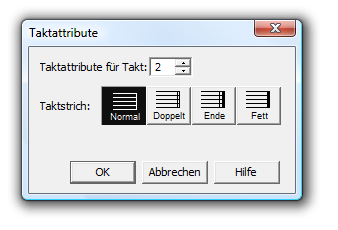 - Taktstrich: Normal • Doppelt • Ende • Fett. Klicken Sie das Symbol des Taktstrichs, den Sie als Taktstrich des Taktes verwenden wollen, oder doppelklicken Sie den gewünschten Taktstrich, um ihn anzuwählen und die Dialogbox zu verlassen.