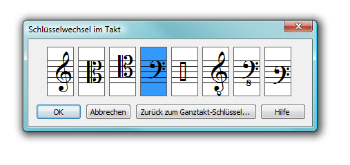 - Schlüssel. Die Palette zeigt Ihnen den ausgewählten Schlüssel. Um einen anderen Notenschlüssel anzuwählen, klicken Sie diesen an, oder doppelklicken Sie einen Notenschlüssel, um ihn anzuwählen und die Dialogbox zu verlassen.