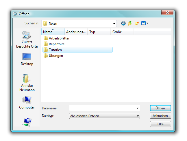 - Wählen Sie den Dateityp, den Sie öffnen oder speichern möchten aus dem Auflappmenü oder wählen Sie „Alle Dateien“, dann bekommen Sie alle Datein, unabhängig vom Dateityp angezeigt. Voreingestellt ist „Alle lesbaren Dateien“.