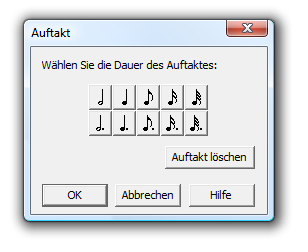 Die Dialogbox „Auftakt“ ermöglicht Ihnen den ersten Takt des Stückes als Auftakt einzurichten. PrintMusic fügt automatisch leere „Platzhalterschläge“ vor den eigentlichen Auftakt ein und korrigiert die Taktzahlen. Sobald Sie Noten in den Auftakt eingeben, wird er entsprechend der eingestellten Dauer ausgerichtet.