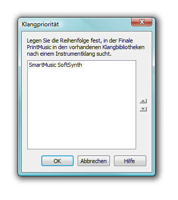 PrintMusic enthält mehrere Klangtabellen, mit deren Hilfe PrintMusics Instrumente mit Klängen aus verschiedenen Klangbibliotheken, wie z. B. Garritan und SoftSynth, verknüpft werden. In dieser Dialogbox legen Sie die Reihenfolge fest, in der Finale in den vorhandenen Klangbibliotheken nach einem Instrumentenklang sucht. Die zuerst zu durchsuchende Klangbibliothek steht dabei an oberster Stelle. Wenn die bevorzugte Klangbibliothek den gewünschten Klang nicht enthält, springt PrintMusic zur Klangbibliothek an zweiter Stelle usw.
