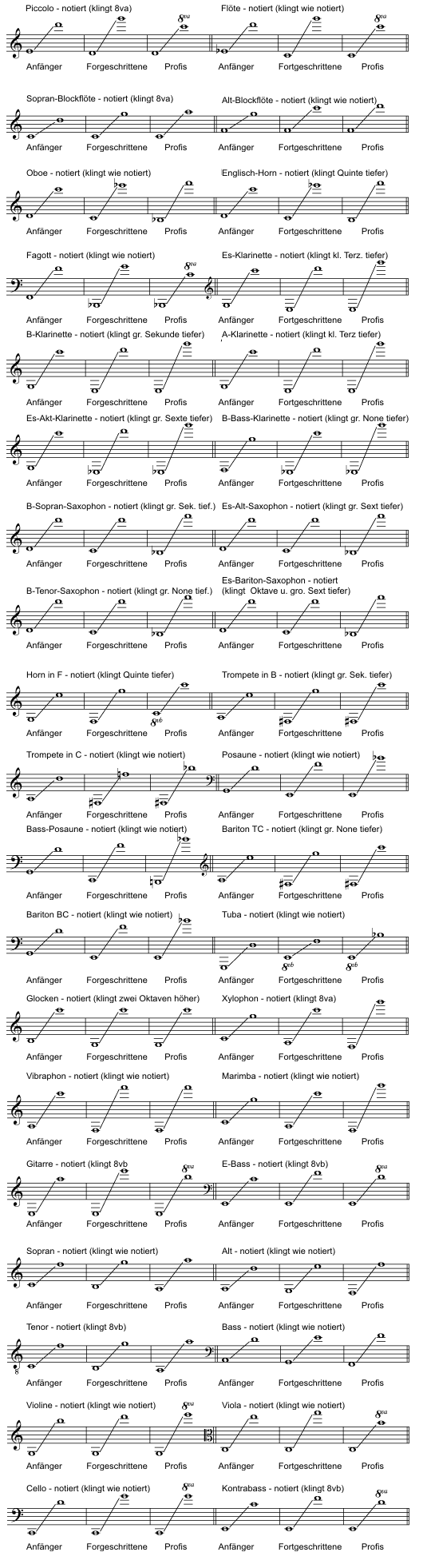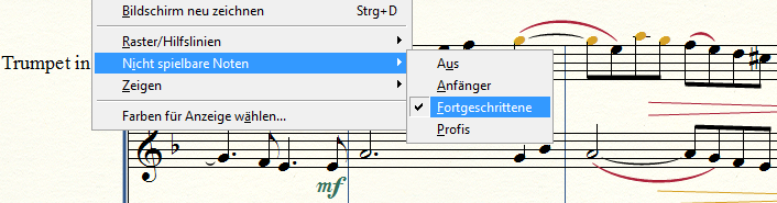 Die Einschränkung des spielbaren Bereichs bei einem Instrument mit unbeschränkten Tonumfang hängt vom ausgewählten Spielniveau des Musikers ab (Anfänger, Fortgeschrittener, Profi). Um den Tonumfang an ein anderes Spielniveau anzupassen, wählen Sie Ansicht > Nicht spielbare Noten > [Spielniveau. Diese Einstellung wird auf alle Dokumente angewendet.