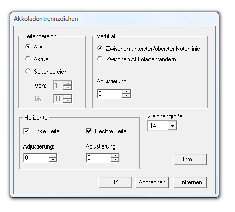 - Entfernen. Klicken Sie „Entfernen“, um Akkoladentrennzeichen, die Sie mit diesem Plug-In hinzugefügt hatten, wieder zu entfernen. Beachten Sie bitte, dass Trennzeichen, die Sie von Hand verändert haben, nicht automatisch entfernt werden können. Es wird deshalb empfohlen, die Akkoladentrennzeichen nicht von Hand zu bearbeiten. Denken Sie daran, dass Sie mit dem Befehl „Widerrufen“ aus dem Menü „Bearbeiten“ die Trennzeichen sofort nach dem Erzeugen wieder entfernen können, wenn Sie mit dem Ergebnis nicht zufrieden sind.