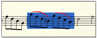 Unter einem eintaktigen Taktstapel ist also ein Takt zu verstehen, wie er von allen Instrumenten (Systemen) in der Akkolade gespielt wird – in anderen Worten also ein vertikaler Schnitt durch die Partitur. In der horizontalen Ausrichtung kann ein Taktstapel natürlich eine beliebige Anzahl (Länge) von Takten haben. Enthält eine Akkolade nur ein Notensystem, so stellt die Anwahl eines ganzen Taktes automatisch auch die Anwahl eines Taktstapels dar, der beim Kopieren, Einfügen oder Einsetzen als solcher behandelt wird. Die Anwahl eines Taktstapels in einer Akkolade mit nur einem Notensytem erkennen Sie daran, dass die Bereichsmarkierung über die oberste und unterste Linie des Notensystems hinausgeht (siehe Abbildung).