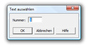 Sie befinden sich hier: Referenz > Paletten, Werkzeuge, Menüs & Dialogboxen > Dialogboxen > Text auswählen
