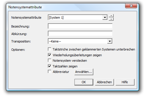 Sie befinden sich hier: Referenz > Paletten, Werkzeuge, Menüs & Dialogboxen > Dialogboxen > Notensystemattribute