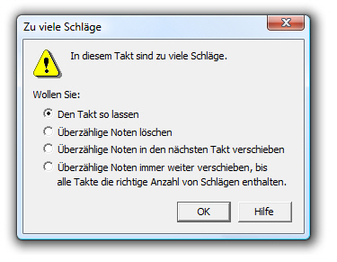Diese Dialogbox teilt Ihnen mit, dass Sie zu viele Taktschläge in einen Takt eingetragen haben, und fragt Sie, wie die überzähligen Schläge jetzt gehandhabt werden sollen.