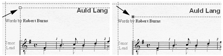 - Drücken Sie Strg-Umschalttaste-´ (Apostroph). Dieses Tastaturkürzel weist PrintMusic an, den Textblock bündig mit dem linken Rand der Seite auszurichten. Sie haben