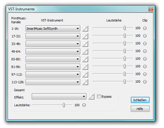 In dieser Dialogbox wählen Sie das gewünschte VST-Instrument, dass Sie mit PrintMusic verwenden wollen. Mit Hilfe dieser Dialogbox können Sie VST--Instrumentenbibliotheken laden und deren Lautstärke anpassen.