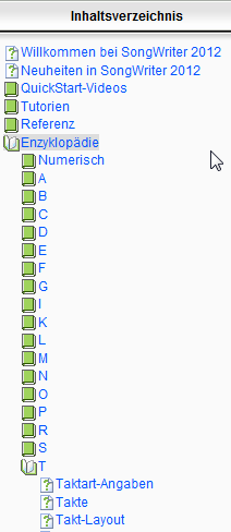 Der komplette Inhalt des SongWriter 2012-Benutzerhandbuchs basiert auf HTML und kann mit dem Internet-Browser Ihres Computers geöffnet werden. Hier finden Sie nun einige Tipps und Anleitungen, wie Sie mit dieser interaktiven Hilfe umgehen. Das Navigationsfenster der Hilfe erscheint links vom eigentlichen Inhaltsfenster.
