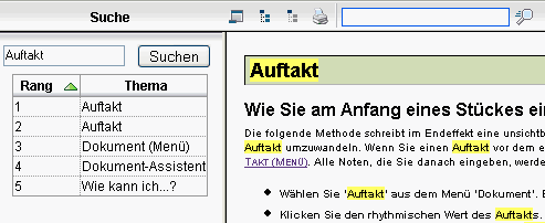 -Taste und geben Sie ein Suchwort (oder mehrere Suchwörter) in das Texteld oben ein, um die Volltextsuche in der Hilfedokumentation zu starten. Die Ergebnisliste (links) der Suche wird dann nach verschiedenen Kriterien sortiert (Anzahl der Suchtreffer im Hilfethema, in der Überschrift eines Hilfethemas usw.). Klicken Sie auf einen Eintrag in der Ergebnisliste, um das Thema aufzurufen. Die mit der Suche übereinstimmenden Treffer werden im Text farbig hervorgehoben.