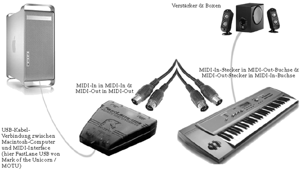 Für ein Basis-MIDI-System benötigen Sie neben Ihrem Computer zumindest folgende Komponenten:
