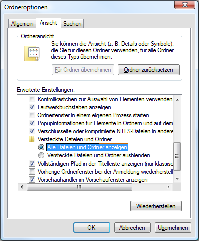 Viele der von SongWriter verwendeten Dateien (wie Bibliotheken, Dokumentstile usw.) werden auf der Festplatte in einem benutzerspezifischen Ordner abgespeichert, und zwar unter „C:/Benutzer/<Benutzername>/AppData/Roaming/MakeMusic/Finale SongWriter 2012“ (unter Windows XP: „C:/Dokumente und Einstellungen/<Benutzername>/Anwendungsdaten/MakeMusic/Finale SongWriter 2012“). Dieser Ordner wird vom Windows-Betriebssystem normalerweise nicht angezeigt, obwohl er vorhanden ist. Wenn Sie Ihre eigenen Dateien zu den von Finale installierten hinzufügen möchten (z. B. eigene Bibliotheken oder Dokumentstile), so müssen Windows zunächst einmal so einstellen, dass Sie diesen unsichtbaren Ordner sehen und auswählen können.